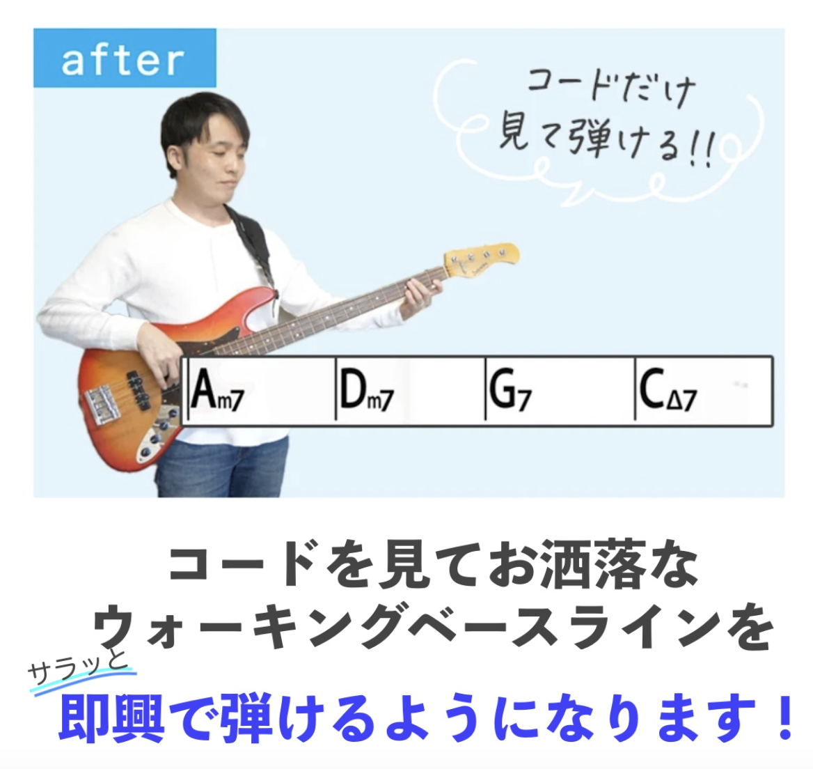 しかし独学では、正しいカリキュラムがなかったり、客観的なフィードバックが得られなかったりするため、多くの方が「コードを見てすぐにウォーキングベースを奏でる」段階に到達できずに行き詰まってしまいます。