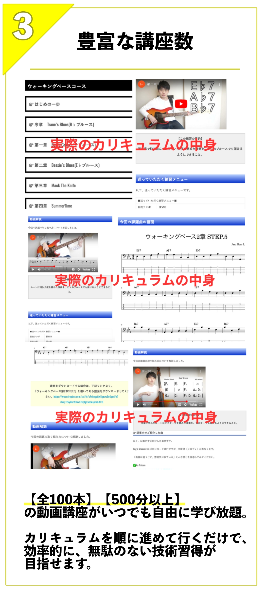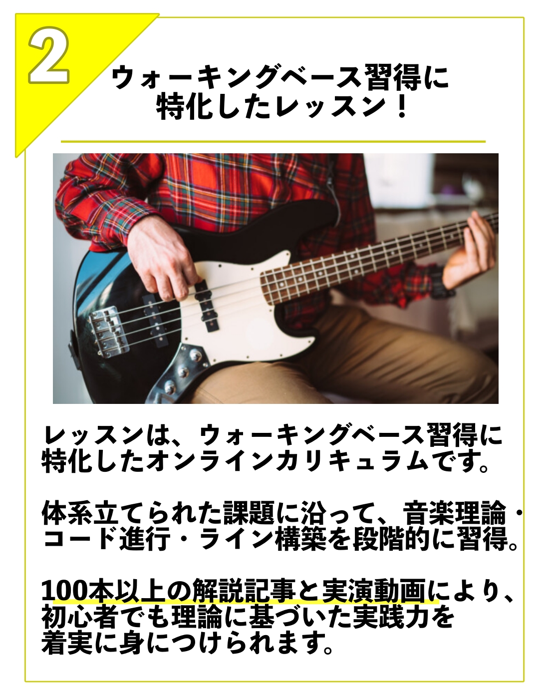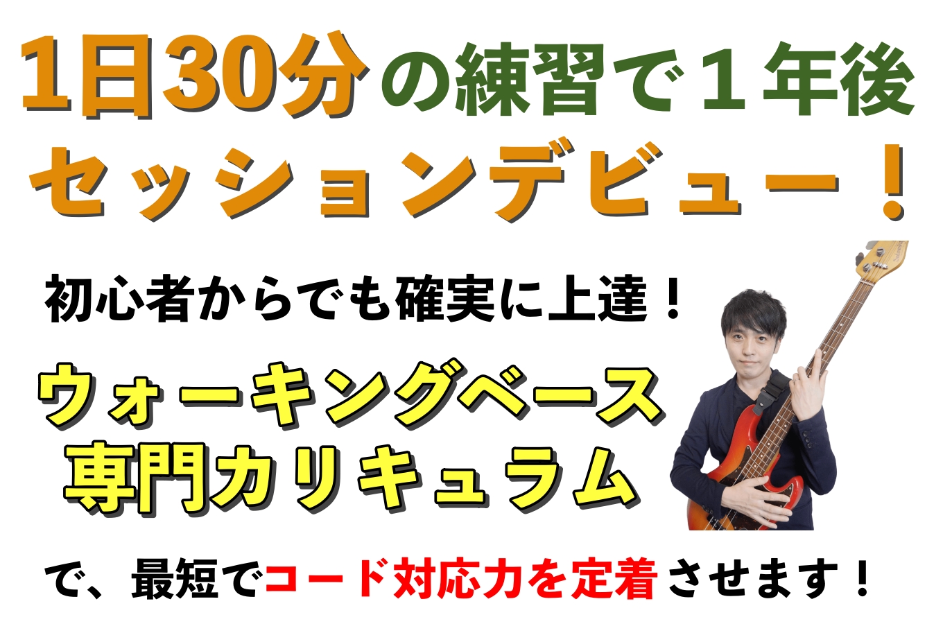 そんな、これまで独学で挑戦してみたものの途中で挫折してしまった方や、何年も「いつかウォーキングベースを弾けるようになりたい」と思いながら実現できなかった方のために、専用のカリキュラムを用意しました。
