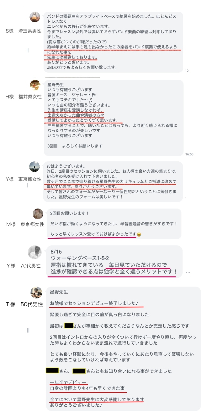 A. 10代〜80代まで幅広い年齢層の方が受講しています。趣味でベースを始めた方から、プロを目指す方、長年ロックをやっていた方のステップアップまで、さまざまな方が在籍しています。 |